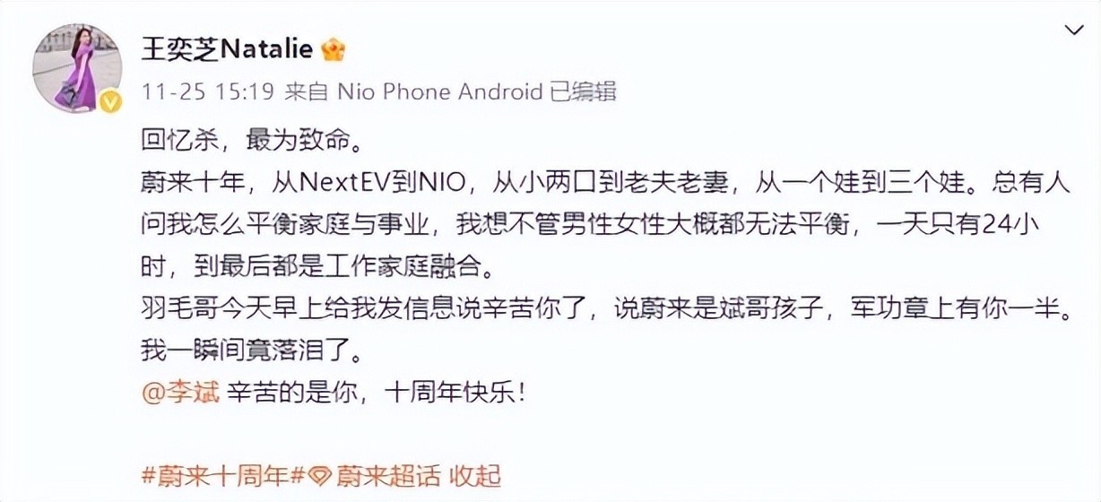 2024年,蔚来迎来成立十周年的重要节点,她在社交平台发文感慨: