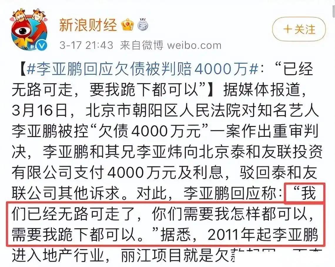 李亚鹏上个月刚和媳妇海哈金喜离婚了。俩人之前说好一起还债,结果撑了三年还是散了。微博上他们发视频说分居都快半年了,孩子跟着女方,两人不吵不闹办的手续。法院文件显示李亚鹏现在欠着四个亿。以前和王菲结婚时家产不少,现在光是别墅就卖了好几套。离婚视频发出来那天,网上有人骂他,说早该分开,也有人说女方不容易,三十多岁带俩孩子还债太难。